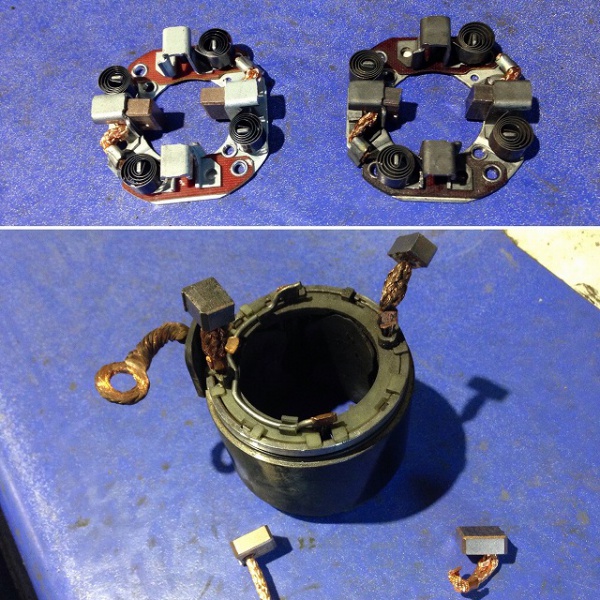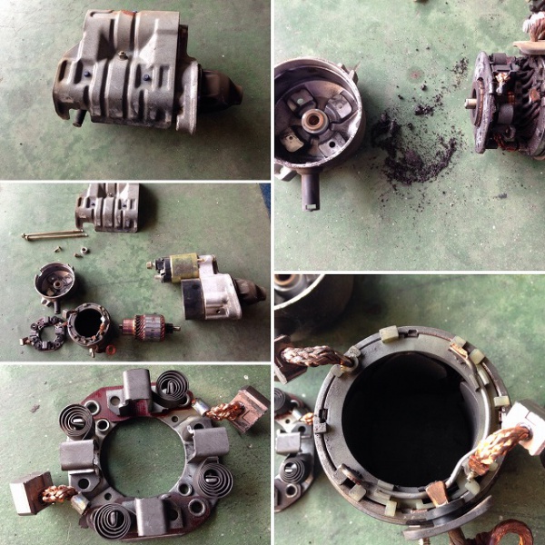 お客様より、エンジンの掛りが悪いという事で入庫、お話を伺うとスターターモーターが回らないとの事で、バッテリーを点検するも異常がない為、スターターモーターを取外し点検してみると、ブラシが摩耗して接触が悪い事がわかった。 このスターターモーターは、内部部品供給がある為、部品交換をする事にしました。