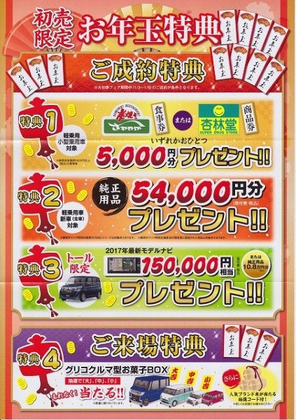 初売り、ご成約特典や初夢お年玉価格、ご来場特典に車検予約頂いたお客様に福袋プレゼント!!